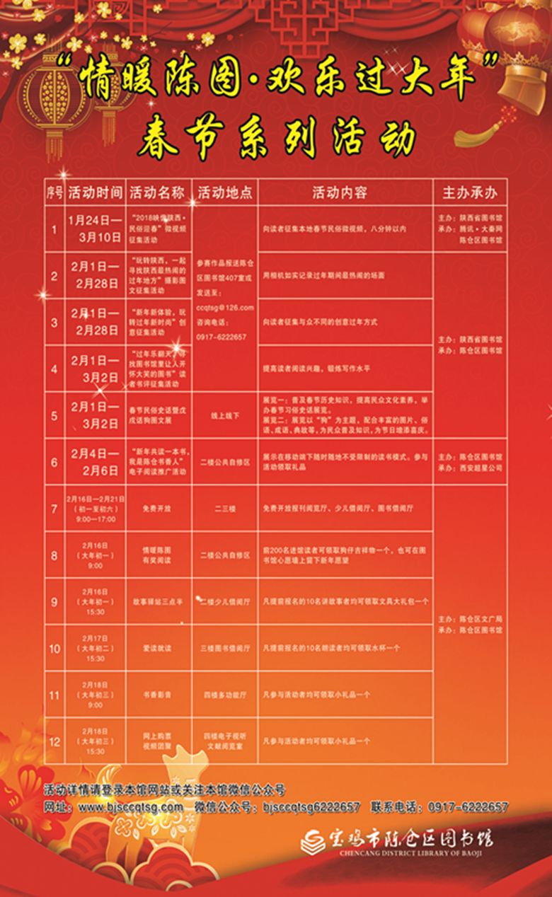信息来源:陈仓区图书馆  ‖  发稿作者:管理员   ‖  发布时间:2018年2月1日  ‖  查看1903次  ‖   字体:[] [] []