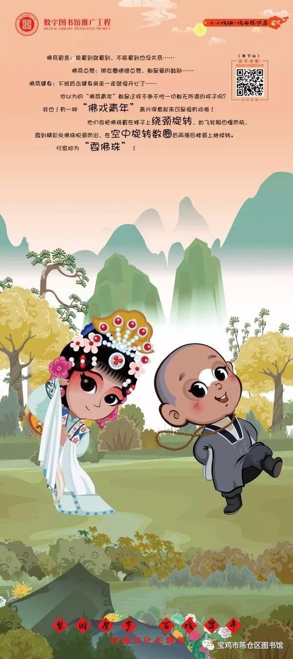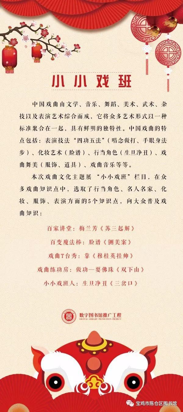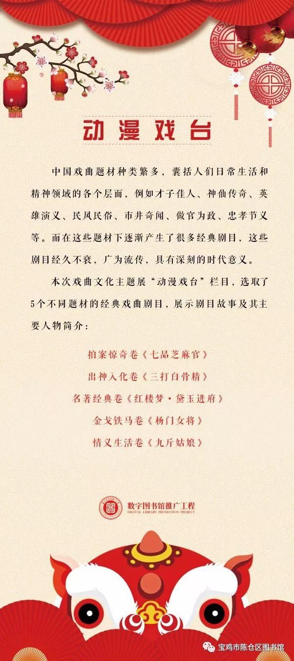 传统戏曲是几百年来国人春节期间的重要文化娱乐活动,陈仓区图书馆结合数字图书馆推广工程资源库“中国戏曲文化知识库”内容,设计兼具文化性、知识性和互动性的线上展览,让公众直观认识到中国传统戏曲艺术的文化魅力。每张戏曲展板将附有相关资源二维码,可通过扫码进入互动体验界面,获取更多戏曲文化资源。