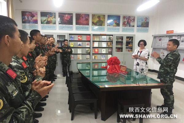 7月11日,武警陈仓中队一场别开生面的送书仪式拉开了军民共建书香军营的序幕,区图书馆馆长孙晓梅一行冒雨深入军营将21种21册价值八百多元的图书送给了武警中队战士。在为武警中队举行馆外借阅点挂牌仪式后,馆长孙晓梅和武警中队指导员商展鹏深入探讨了部队文化建设的设想和打算,双方表示共同努力构建特色军营文化。孙馆长希望武警官兵不光要练就过硬的军事本领,更要有丰富的知识储备,这才是读习主席的书,听习主席的话,做习主席的好战士。随后察看了武警中队图书室软硬件建设,并表示下次将把电子书借阅机带到军营,在手机上可下载海量信息资源,实现智能化阅读。武警战士们个个英姿飒爽,精神振奋,表示将在军队的大熔炉捶打磨炼,提高文化素养,做党和人民的忠诚卫士。(杨宝霞)