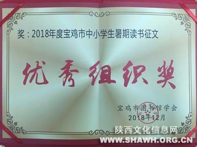陈仓区图书馆荣获2018年度图书馆学会工作先进单位、荣获2018年度宝鸡市中小学生暑期读书征文优秀组织奖,馆长孙晓梅荣获2018年度图书馆学会工作先进个人。
