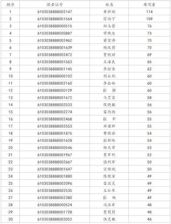 陈仓区图书馆为了鼓励更多的读者参与读书,大力倡导“书香陈仓·全民阅读”的浓厚氛围,在全社会形成“多读书、爱读书、善读书"的良好意识,本馆依据文献借阅系统记录,对2018年度借阅量排名前30名的读者予以通报表彰。现将名单公示如下: