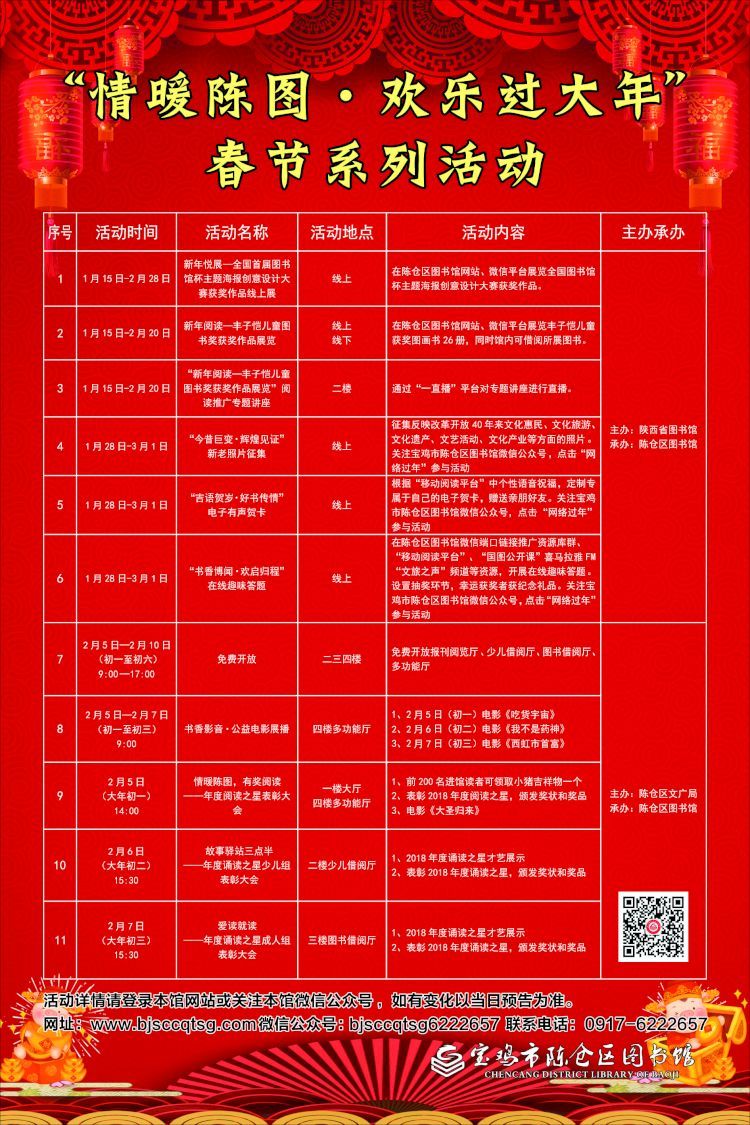 以上线上活动参与方式:在陈仓区图书馆网站、微信平台参观展览,或者关注宝鸡市陈仓区图书馆微信公众号,点击“网络过年”参与活动。