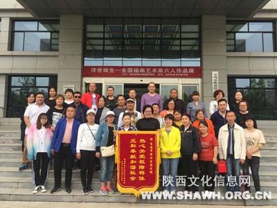 最后,邀请所有到馆的残疾人朋友在一楼大厅参观浮世绘生—全国插画艺术家六人作品展,陈仓区残疾人联合会为陈仓区图书馆送上“热心关爱视障群体,无私奉献和谐社会”的锦旗,并合影留念。