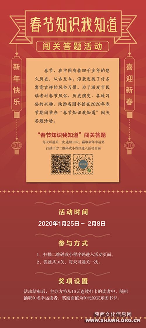 春节,在中国有着四千多年的悠久历史,从古至今,沿袭发展了许多寓意吉祥的风俗习惯。我国幅员辽阔,各地区庆祝春节的方式也不尽相同。为了激发市民读者对春节风俗、历史演变、各地习俗的兴趣,陕西公共图书馆服务联盟联合我馆于2020 年春节期间,借助微信平台举办“春节知识我知道”闯关答题活动。