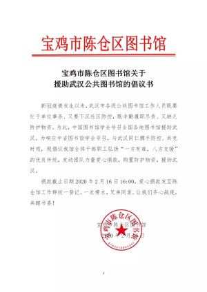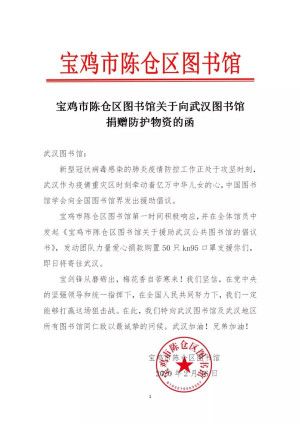 新冠疫情发生以来,武汉各级公共图书馆工作人员辛勤履职尽责的同时缺乏防护物资。2月15日晚,宝鸡市陈仓区图书馆收到中、省图书馆学会倡议,号召通过捐赠物资或提供可靠采购渠道等方式,援助武汉同仁抗击新冠肺炎疫情。