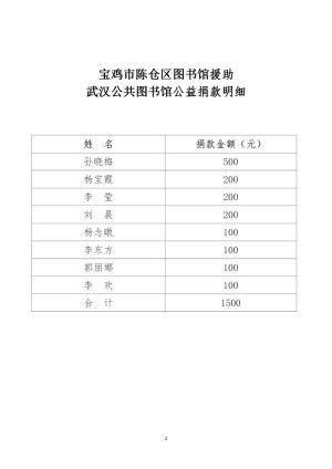 2月16日,宝鸡市陈仓区图书馆与武汉图书馆取得联系,同时在全体馆员中发起《宝鸡市陈仓区图书馆关于援助武汉公共图书馆的倡议书》,倡导大家捐款购置物资,支援武汉同仁。当天,不到半个小时就收到本馆全体馆员捐款1500元,并第一时间购置50只kn95口罩于18日寄往武汉图书馆。