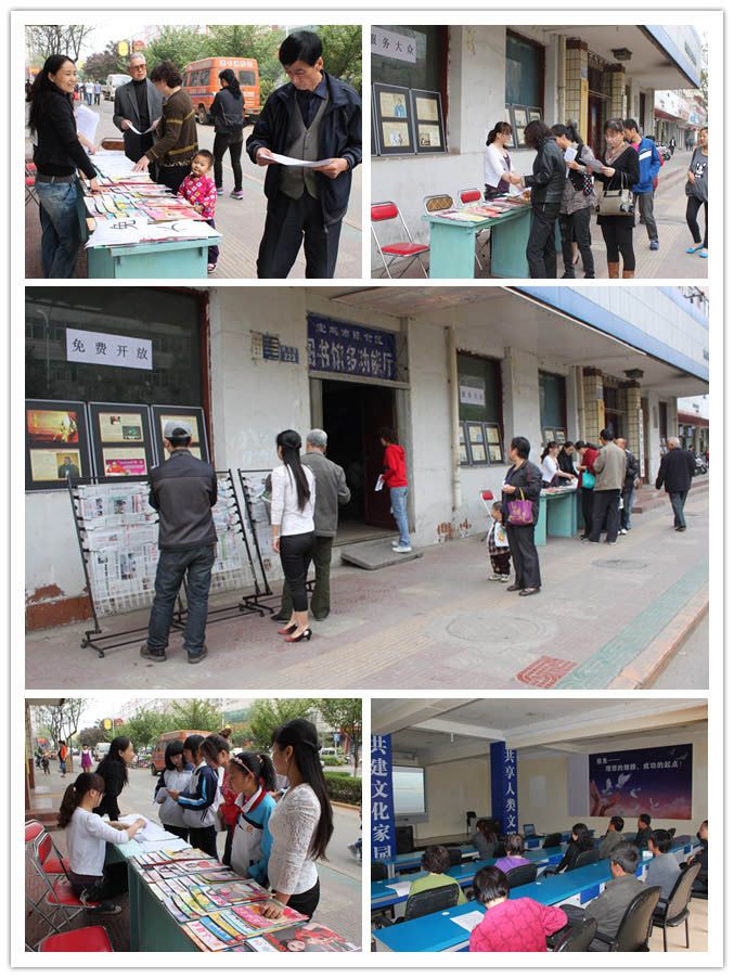 活动中,一方面展出“《文化强国之——华夏之光》图片24幅、报刊20种、杂志60册;另一方面散发《4.23世界读书日倡议书》、《生活小常识》、《未成年人安全防范》、《陈仓区图书馆免费开放项目和免费开放时间》、《春季生活小常识大全》信息资料5种3000余份;再一方面在多功能厅播放由国家图书馆与文化部全国文化信息资源建设管理中心联合发起的“县级数字图书馆推广计划——灾区援建行动”推送的1TB的数字资源,有视频资源《百年守望》、《馆藏故事》、《文明与创造》;书刊资源《电子图书》、《电子期刊》;图片资源《年画撷英》、《前尘旧影》;网络资源《政府信息》、《中国事典》。