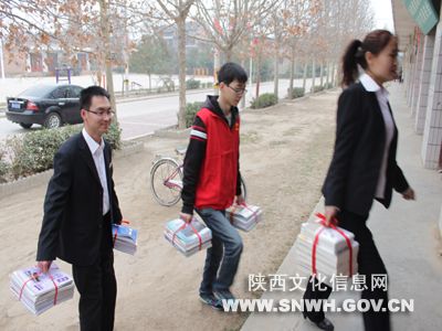 刚刚闭幕的全国“二会”,“全民阅读”再次写进《政府工作报告》,一个民族的精神境界,在很大程度上取决于全民族的读书水平,“行万里路,读万卷书”为了继承和发扬这样的优良传统,3月16日,陈仓区图书馆开着流动图书车来到周原镇有礼村文化站,为农家书屋赠送由陕西省图书馆提供的《金秋》、《农业与科技》等杂志400册;同时送去地方文献《小醋大用》、《炎黄大帝》等图书10册。一捆捆书籍绑上了红丝带,为有礼村送去了一缕书香,增添了一份色彩。