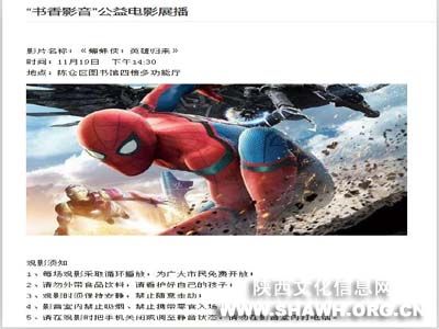 书香陈仓.全民阅读开展的一系列周日活动受到了大量读者的关注,读者积极参与到活动中来,大大提升了图书馆的社会影响力,发挥了良好的社会效益。 2017年11月19日下午14:30,公民道德讲堂2017年第1期(总第109期)——“书香影音”公益电影展播第一次与读者见面,影片《蜘蛛侠:英雄归来》深受大家喜爱,四楼多功能厅座无虚席。 欢迎喜爱看电影的你走进图书馆,每月的第三个周日下午14::30,不见不散。(牟凯)