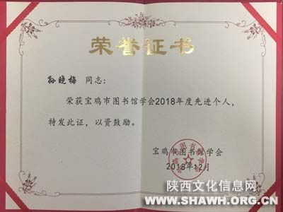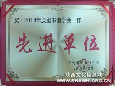 陈仓区图书馆荣获2018年度图书馆学会工作先进单位、荣获2018年度宝鸡市中小学生暑期读书征文优秀组织奖,馆长孙晓梅荣获2018年度图书馆学会工作先进个人。