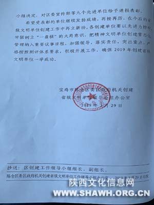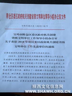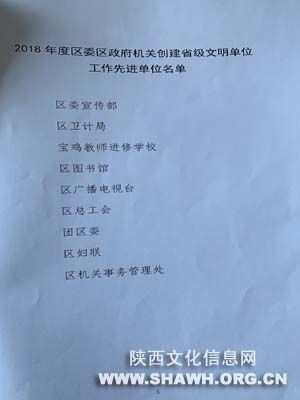 区政府的正确领导和区创建办的精心组织下,开展了具特色的精神文明创建活动,圆满完成了省级文明单位创建年度工作任务,根据《陈仓区委区政府机关创建省级文明单位工作考核办法》,区委区政府机关创建省级文明单位工作领导小组决定,区委宣传部、区卫计局、宝鸡教师进修学校、区图书馆、区广播电视台、区总工会、团区委、区妇联、区机关事务管理处九家单位评为2018年度区委区政府机关创建省级文明单位工作先进单位。
