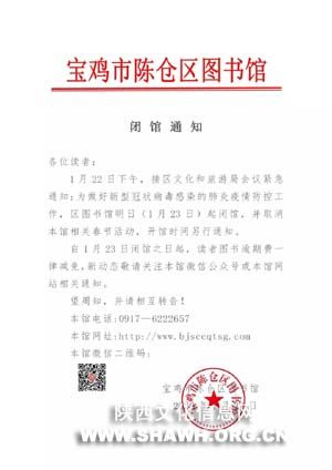 信息来源:陈仓区图书馆  ‖  发稿作者:管理员   ‖  发布时间:2020年2月7日  ‖  查看5149次  ‖   字体:[] [] []