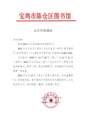 信息来源:陈仓区图书馆  ‖  发稿作者:管理员   ‖  发布时间:2020年12月27日  ‖  查看6553次  ‖   字体:[] [] []